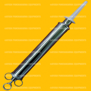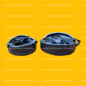 This equipment called Janu vasthy. Its inner layer is made of thin aluminium sheet and outer layer is made of rubber sheet and edges are covered with rubber beading. Two straps are provided to tie properly. It is available in two sizes – big and small.